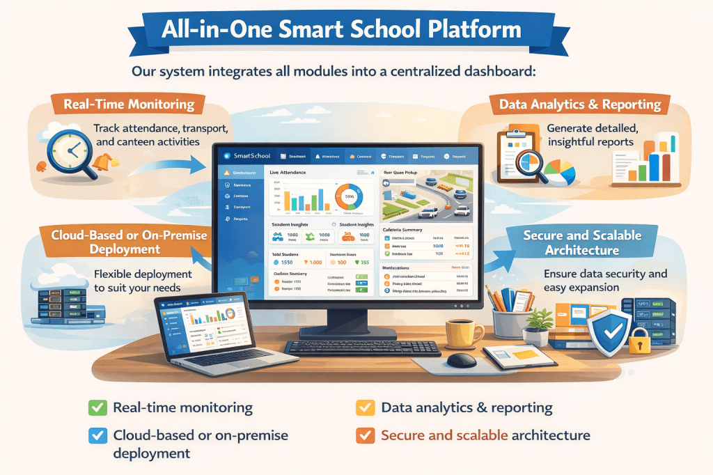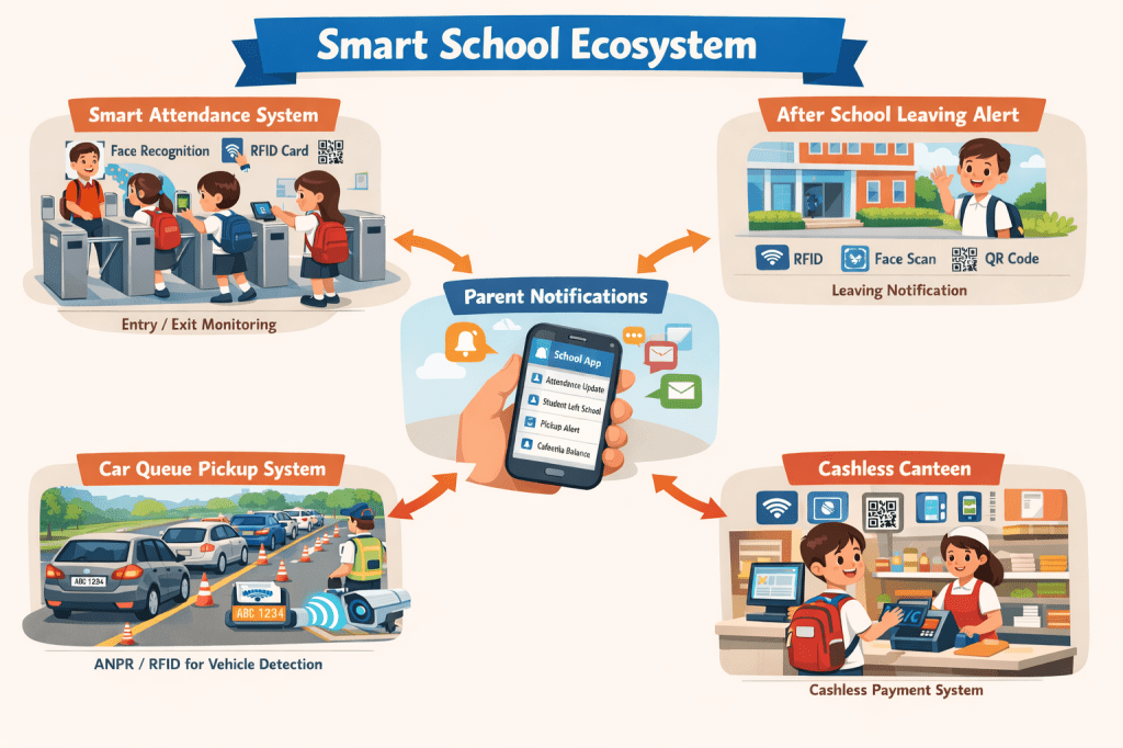 Upgrade your campus with a Smart School Ecosystem that integrates attendance tracking, student safety, parent communication, car pickup automation, and cashless payments into one seamless platform.